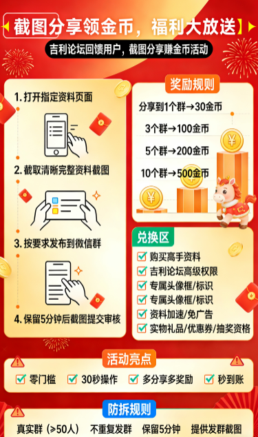 吉利论坛为回馈广大用户,论坛现推出QQ微信截图分享资料赚金币活动!